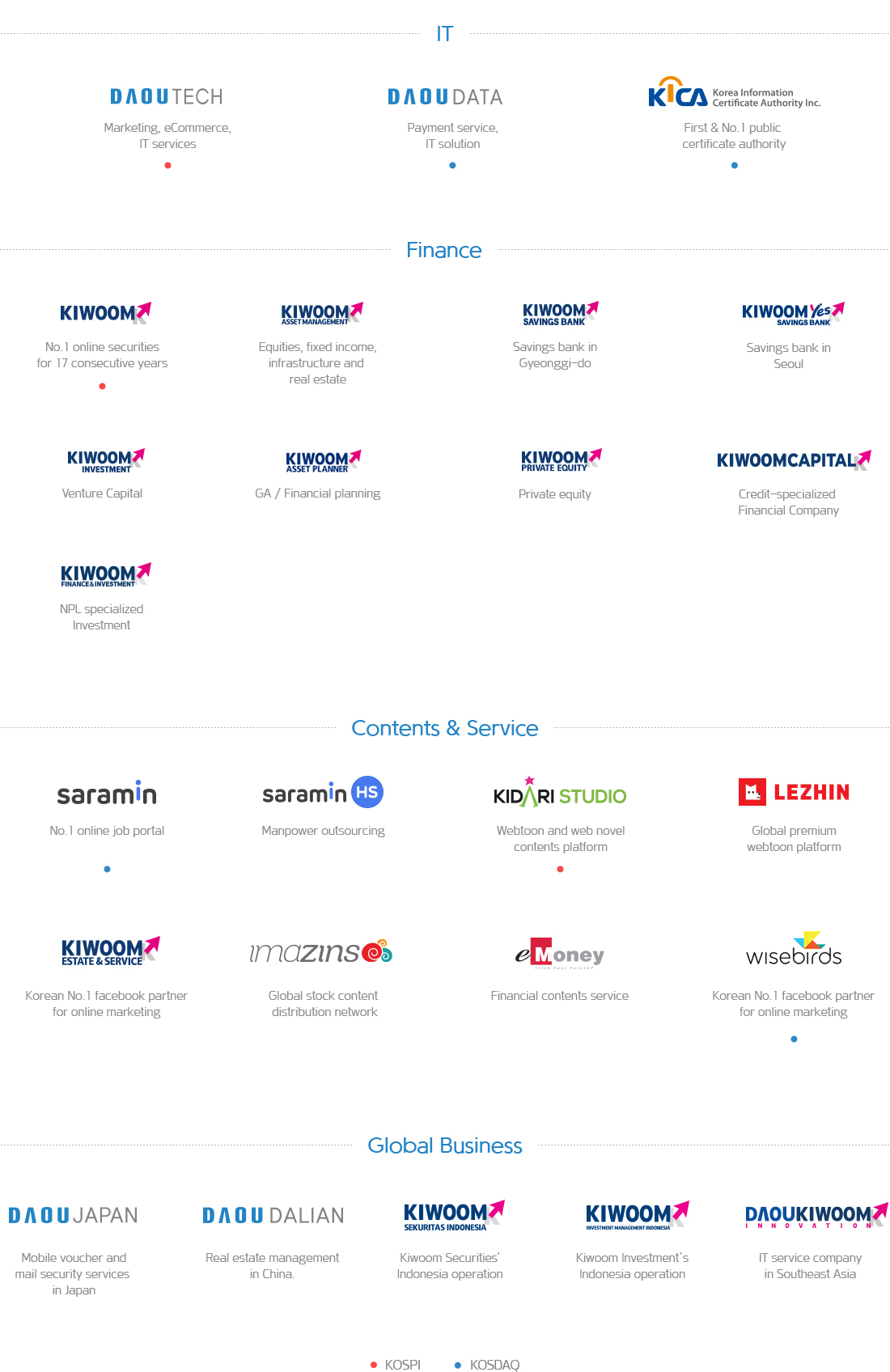 With the first listing of Daou Technology on the KOSPI market in 1997, today DaouKiwoom Group has 3 affiliates listed on KOSPI and 4 on KOSDAQ,