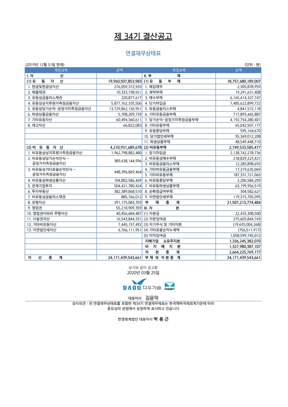 제34기 결산공고 - 연결 재무상태표