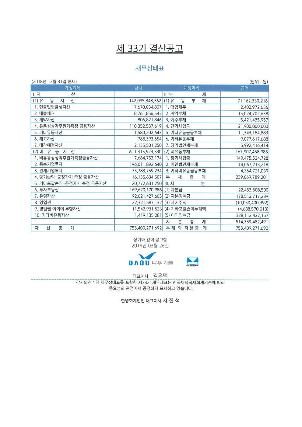 [공고] 제33기 결산 공고 - 별도 재무상태표