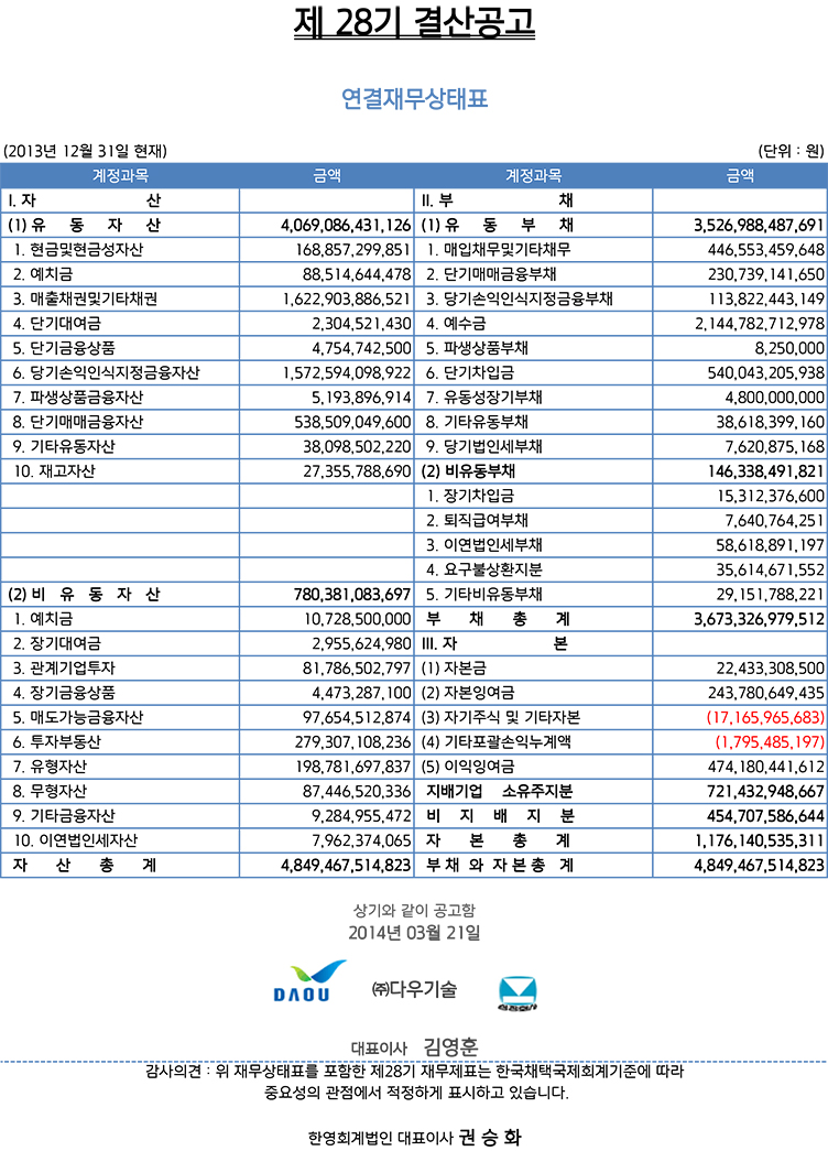 [공고] 제 28기 결산 공고 - 연결 재무상태표