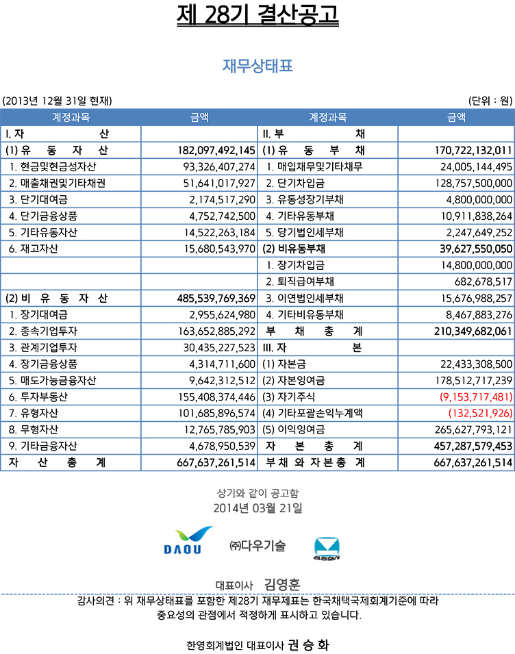 [공고] 제 28기 결산 공고 - 별도 재무상태표