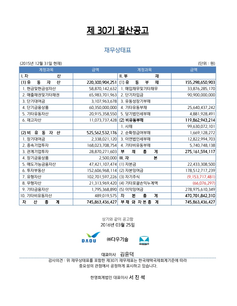 [공고] 제30기 결산 공고 - 별도 재무상태표