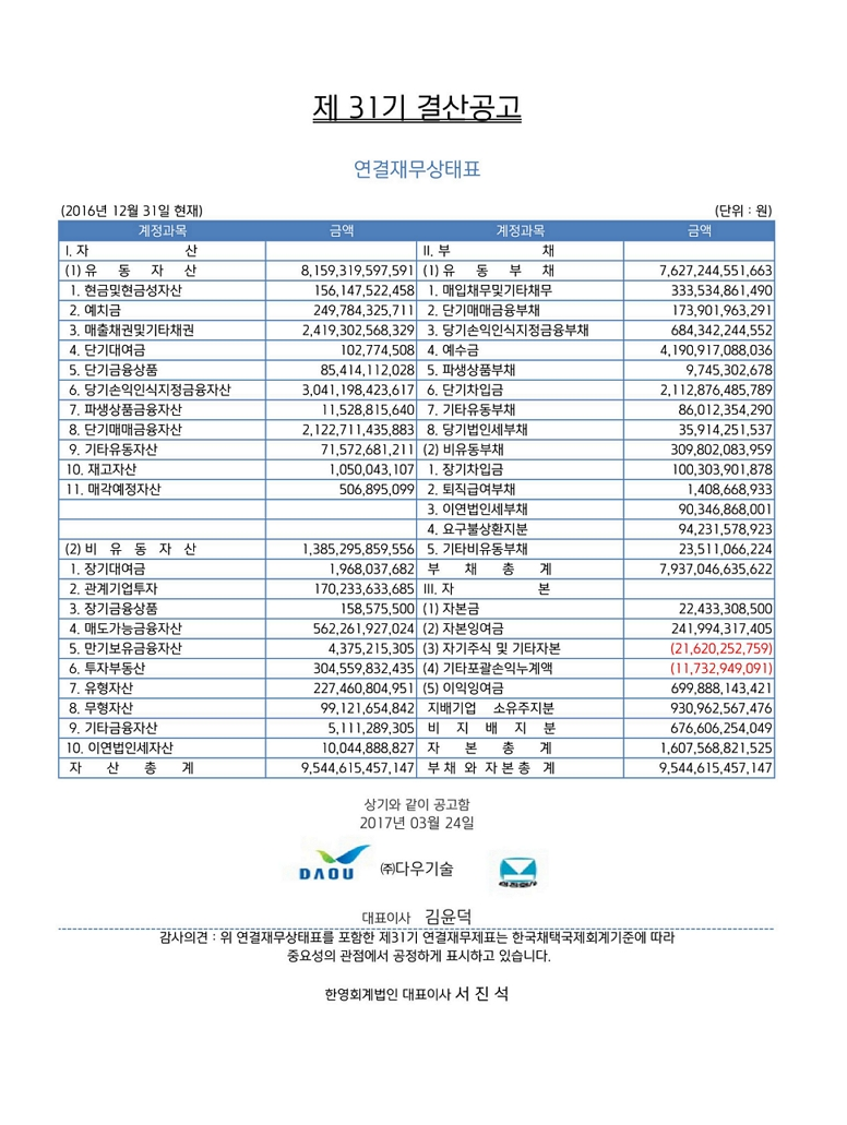 [공고] 제31기 결산 공고 - 연결 재무상태표