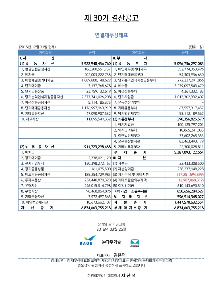 [공고] 제30기 결산 공고 - 연결 재무상태표